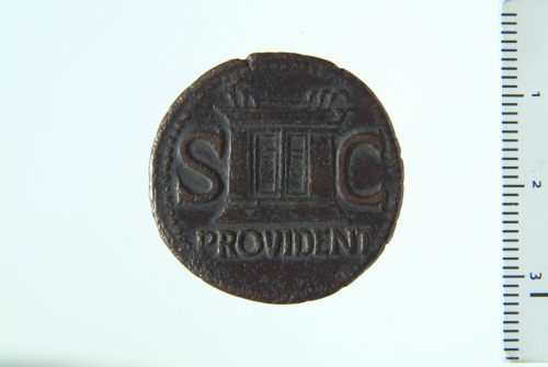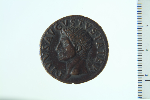 Dritto: Testa del Divo Augusto radiato a s.; contorno perlinato. Rovescio: Altare con porta a due pannelli e decorazioni; contorno perlinato