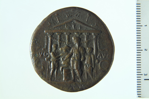 Dritto: Pietas velata e drappeggiata seduta a s. con patera, il braccio sinistro appoggiato su una piccola figura drappeggiata stante frontalmente su base; contorno perlinato. Rovescio: Tempio esastilo con ghirlande sormontato da quadriga, davanti al quale Caligola velato e togato sacrifica con patera su altare ghirlandato; un assistente conduce un toro all'altare, l'altro regge una patera; contorno perlinato