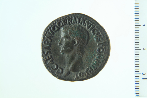 Dritto: Testa di Caligola a s.; contorno perlinato. Rovescio: Vseta velata seduta su trono decorato a s. con patera e lungo scettro trasversale; contorno perlinato