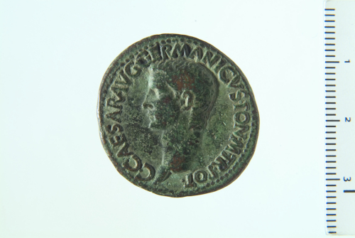 Dritto: Testa di Caligola a s.; contorno perlinato. Rovescio: Vseta velata seduta su trono decorato a s. con patera e lungo scettro trasversale; contorno perlinato