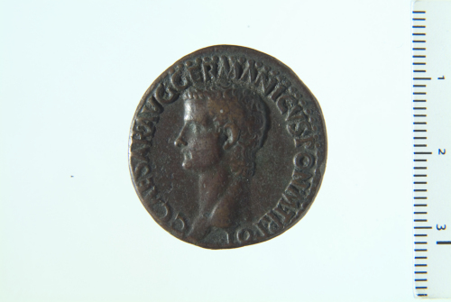 Dritto: Testa di Caligola a s.; contorno perlinato. Rovescio: Vseta velata seduta su trono decorato a s. con patera e lungo scettro trasversale; contorno perlinato