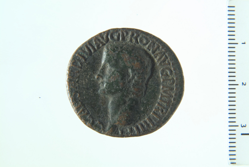 Dritto: Testa laureata di Caligola a s.; contorno perlinato. Rovescio: Vesta velata seduta su trono decorato a s. con patera e lungo scettro trasversale; contorno perlinato