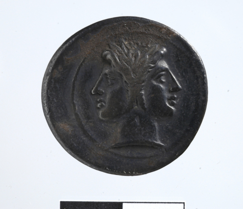 Dritto: Testra laureata gianiforme dei Dioscuri. Cerchio di puntini.. Rovescio: Giove in quadriga a d., guidato da Vittoria. Giove trattiene lo scettro nella mano s. e scaglia un fulmine con la d. Cerchio lineare.