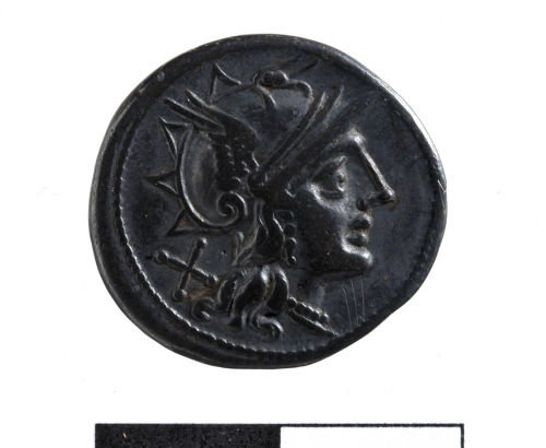 Dritto: Testa elmata di Roma a d. Cerchio di puntini.. Rovescio: Vittoria, in biga a d., trattiene una frusta nella mano d. e le redini nella s. Cerchio lineare.