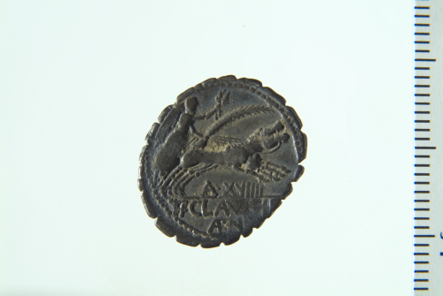 Dritto: Busto di Diana drappeggiato a d. con arco e faretra in spalla; contorno perlinato. Rovescio: Biga in corsa a d. guidata da Vittoria con ramo di palma, redini e ghirlanda; contorno perlinato