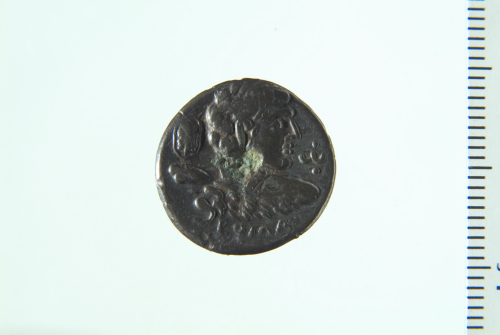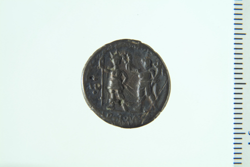 Dritto: Busto di Eracle visto da dietro rivolto a d. con clava; contorno perlinato. Rovescio: Roma stante frontalmente con lancia ed elmo con triplice cresta, viene incoronata da figura stante a s. con ghirlanda e cornucopia; contorno perlinato