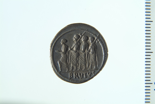 Dritto: Busto di Libertas a d.; contorno perlinato. Rovescio: L. Iunius Brutus incedente a s. tra due littori con fasci e preceduti da un accensus; contorno perlinato