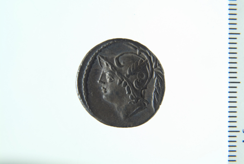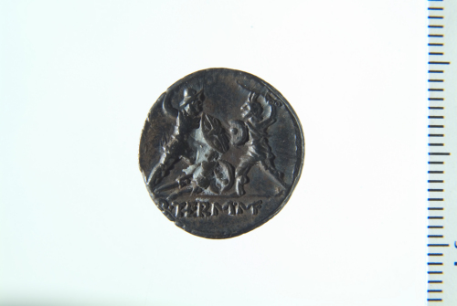 Dritto: Testa elmata di Marte a s.; contorno perlinato. Rovescio: Soldato romano combattente a d. contro soldato barbaro a difesa di un compagno caduto; contorno perlinato