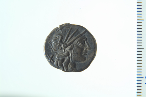 Dritto: Testa di Roma elmata a d.; contorno perlinato. Rovescio: Dioscuri a cavallo a d.; contorno perlinato
