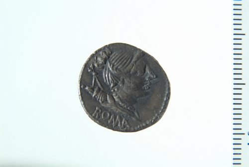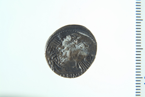 Dritto: Busto di Diana drappeggiato con arco e faretra in spalla a d.; contorno perlinato. Rovescio: Tre cavalieri alla carica a s. verso un guerriero caduto con deu stendardi; contorno perlinato