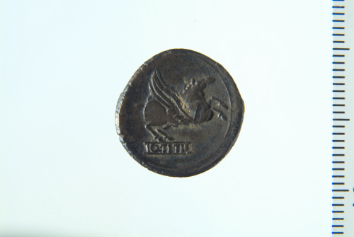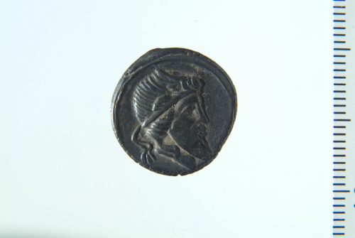 Dritto: Testa barbata e diademata a d.; contorno lineare. Rovescio: Pegaso in volo a d.; contorno lineare