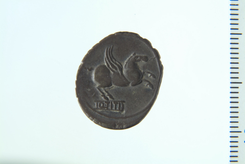 Dritto: Testa di Libero con ghirlanda di vite a d.; contorno lineare. Rovescio: Pegaso in volo a d.; contorno lineare