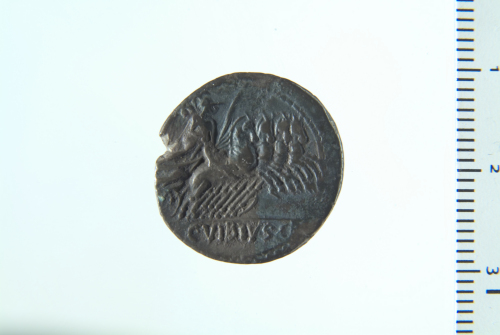 Dritto: Quadriga in corsa a s. guidata da Minerva con redini, lancia e trofeo; contorno perlinato. Rovescio: Quadriga in corsa a d. guidata da Minerva con redini, lancia e trofeo; contorno perlinato