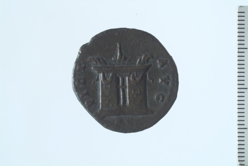 Dritto: Busto drappeggiato di Faustina I a d.; contorno perlinato.. Rovescio: Altare con porta in facciata.