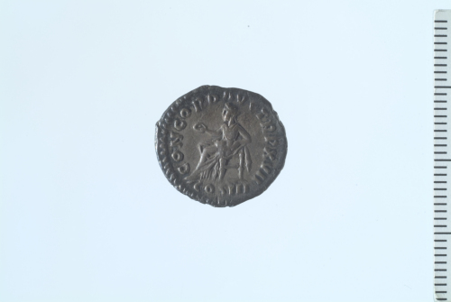 Dritto: Testa nuda di Marco Aurelio a d.; contorno perlinato.. Rovescio: Concordia seduta a s., recante patera e con braccio s. appoggiato su statua di Spes; cornucopie sotto il seggio.