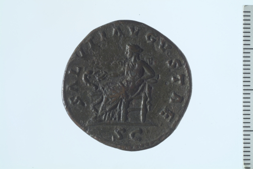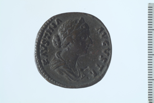Dritto: Busto diademato di Faustina II a d.; contorno perlinato.. Rovescio: Salus seduta a s., in atto di nutrire un serpente avvolto intorno ad un altare; contorno perlinato.