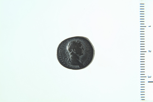 Dritto: Busto laureato di Traiano a d., drappeggiato sulla spalla s.; contorno perlinato (?).. Rovescio: Vittoria avanzante a d., reggente palma e corona; contorno perlinato (?).