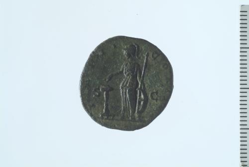 Dritto: Testa radiata di Commodo a d.; contorno perlinato.. Rovescio: Minerva stante a s., in atto di offrire incenso presso un altare, con mano s. appoggiata ad uno scudo e lancia.
