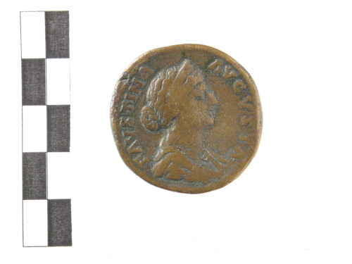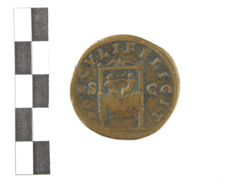 Dritto: Busto drappeggiato di Faustina II a d.; contorno perlinato.. Rovescio: Trono sul quale siedono Commodo e Antonino; contorno perlinato.