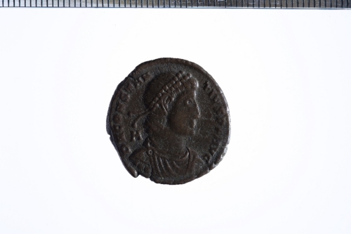 Dritto: Busto diad., drapp. e corazz. a d.. Rovescio: Imperatore stante con trofei nelle mani, cristogramma su ciascun vessillo, es. (delta)SIS(crescente)
