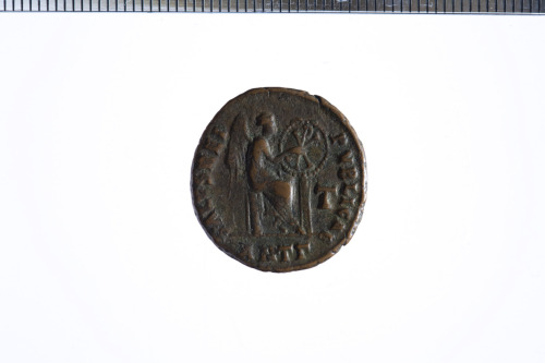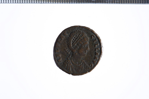 Dritto: Busto di Flaccilla a d.. Rovescio: Vittoria seduta a d. su corazza, scrive il cristogramma su scudo posto su colonna;es. ANT(gamma)