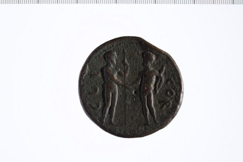 Dritto: Testa laureata di Marco Aurelio a d.. Rovescio: Ercole e Giove stanti l'uno di fronte all'altro, si stringono la mano; l'uno regge la clava, l'altro l'asta.