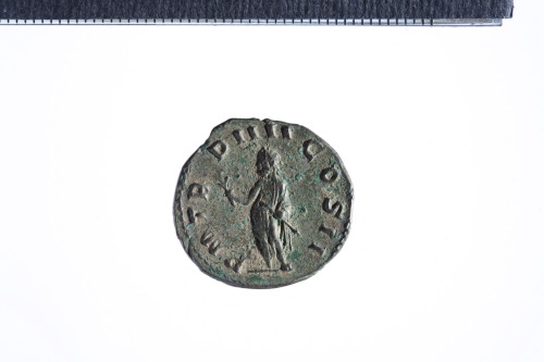 Dritto: Busto radiato e drappeggiato di Volusiano a d.; contorno perlinato.. Rovescio: L'imperatore togato stante a s. con ramo e corto scettro trasversale; contorno perlinato.