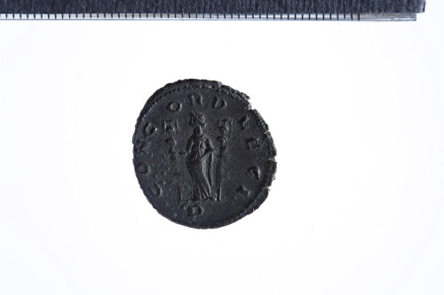 Dritto: Busto radiato e drappeggiato di Aureliano a d.; contorno perlinato.. Rovescio: Concordia stante a s. con due insegne militari; contorno perlinato.