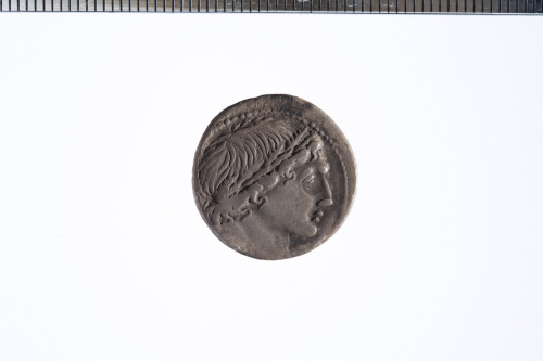 Dritto: Testa di un giovane coronata da una corona di quercia a d. (Apollo?); sotto al mento, un asterisco che in questo esemplare non si legge; c.p.. Rovescio: I Dioscuri stanti di fronte, in mezzo ai loro cavalli, ognuno reggente una lancia; c.p.