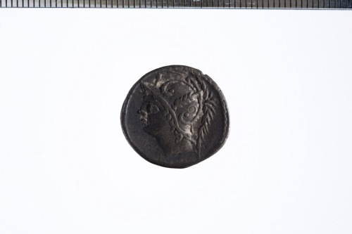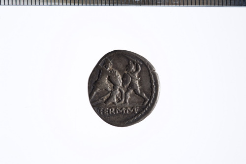 Dritto: Testa galeata di Marte a s. con un elmo piumato e con una lunga cresta; c.p.. Rovescio: Un soldato romano combatte con un soldato barbaro a protezione di un compagno caduto; c.p.