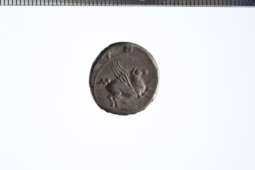 Dritto: Testa barbata e con diadema alato a d.; c.l.. Rovescio: Pegaso a d.; c.l.