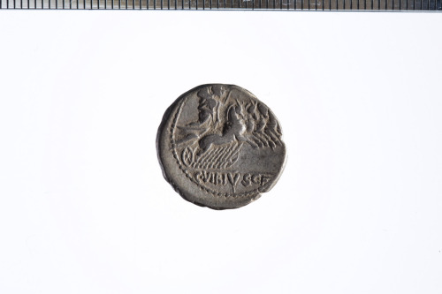 Dritto: Testa laureata di Apollo a d.; sotto il mento lettera di controllo V (punto); c.p.. Rovescio: Minerva in quadriga a d. che regge redini e una lancia con la mano s. e un trofeo con la d.; c.p.