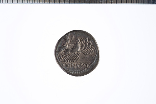 Dritto: Testa laureata di Apollo a d.; sotto il mento lettera di controllo P; c.p.. Rovescio: Minerva in quadriga a d. che regge redini e una lancia con la mano s. e un trofeo con la d.; c.p.