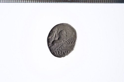 Dritto: Testa laureata di Apollo a d.; sotto il mento un simbolo o lettera di controllo non meglio identificabile; c.p.. Rovescio: Minerva in quadriga a d. che regge redini e una lancia con la mano s. e un trofeo con la d.; c.p.