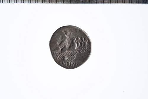 Dritto: Testa laureata di Apollo a d.; sotto il mento un simbolo o lettera di controllo non meglio identificabile; c.p.. Rovescio: Minerva in quadriga a d. che regge redini e una lancia con la mano s. e un trofeo con la d.; c.p.