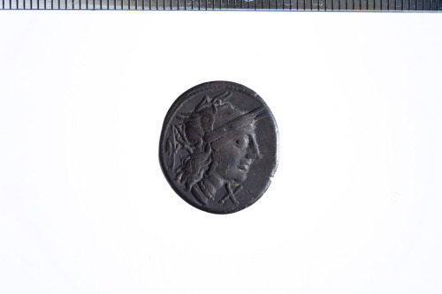 Dritto: Testa elmata di Roma a d.; davanti simbolo di valore X; dietro ramo c.p.. Rovescio: Giove in quadriga verso d. con saetta nella d. e redini nella s.; es. ROMA