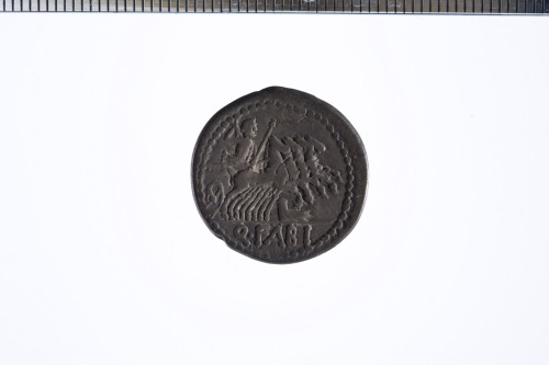 Dritto: Testa elmata di Roma a d., davanti simbolo di valore X, c.p.. Rovescio: Giove su quadriga verso d.; sotto rostro di nave; es. Q.FABI