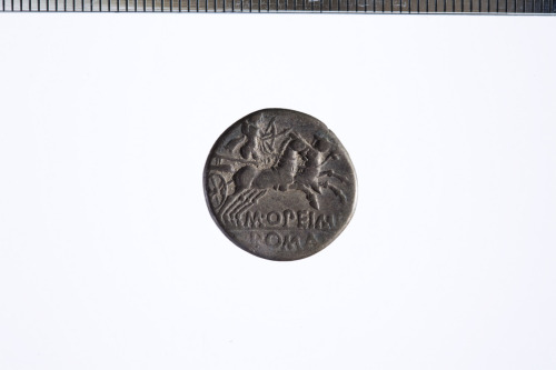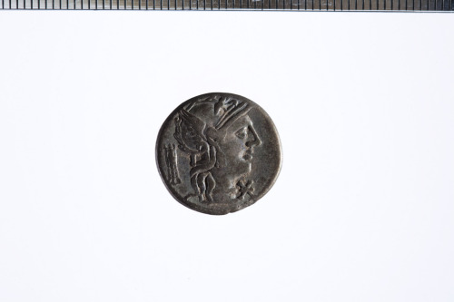 Dritto: Testa elmata di Roma a d., dietro tripode, davanti sotto il mento X barrato, c.p.. Rovescio: Apollo su biga con arco e frecce, es. ROMA
