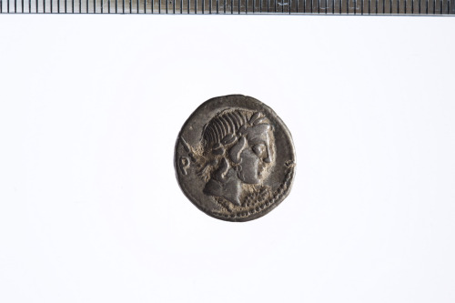 Dritto: Testa laureata di Apollo? a d. con dietro uno scettro; davanti un grappolo d'uva?; c.p.. Rovescio: Cavaliere al galoppo a d. brandendo una lancia; c.p.