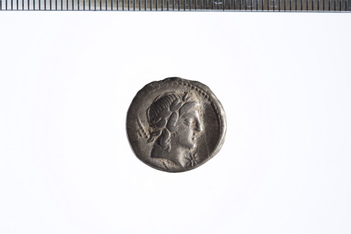 Dritto: Testa laureata di Apollo ? a d. con dietro uno scettro; davanti una stella; c.p.. Rovescio: Cavaliere al galoppo a d. brandendo una lancia; c.p.