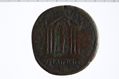 Dritto: Testa laureata di Settimio Severo a d.. Rovescio: Facciata di tempio con sei colonne contenente statua di culto di Artemide Anaitis.