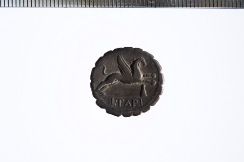 Dritto: Testa di Giunone Sospita a d.; dietro, simbolo tipo Crawford pl. LXVI, n. 85; cerchio di astragali.. Rovescio: Grifone a d. sotto il quale c'è un simbolo di controllo tipo Crawford pl. LXVI, n. 85, n. 153; cerchio di astragali.