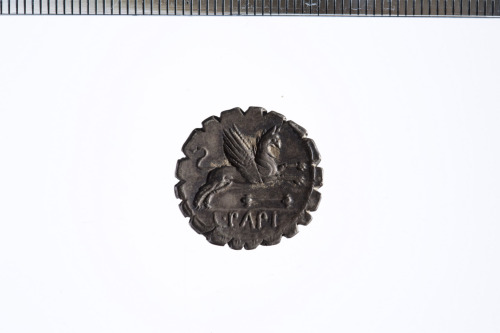Dritto: Testa di Giunone Sospita a d.; dietro, simbolo che si avvicina al tipo Crawford pl. LXVI, n. 16; cerchio di astragali.. Rovescio: Grifone a d. sotto il quale c'è un simbolo di controllo che si avvicina al tipo Crawford pl. LXVI, n. 16; cerchio di astragali.