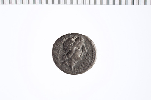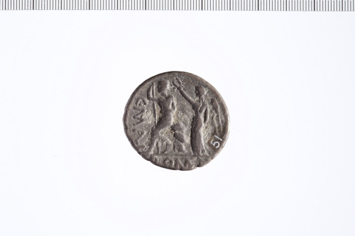 Dritto: Testa laureata di Apollo a d. Contorno perlinato.. Rovescio: Roma seduta su una pila di scudi a s. con spada nella mano s. e lancia nella d. incoronata dalla Vittoria. Contorno perlinato.