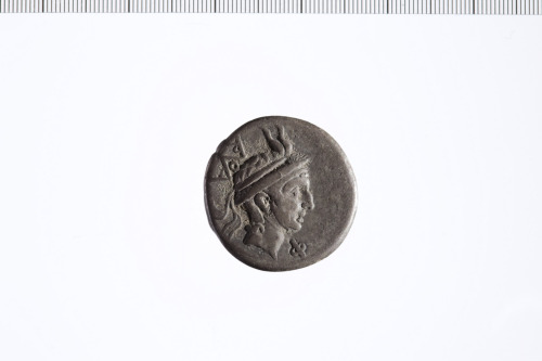 Dritto: Testa maschile a d. con elmo con corna da capra e diadema. Contorno perlinato.. Rovescio: Statua equestre, cavaliere con palma, fiori ai piedi dei cavalli. Contorno perlinato.