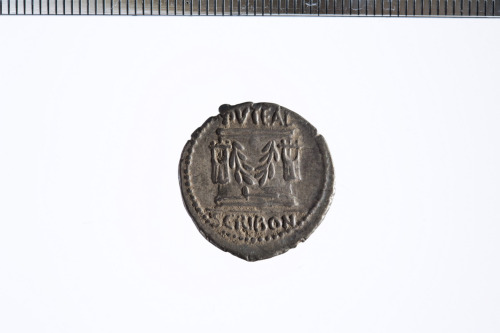 Dritto: Testa del Bonus Eventus a d.; c.p.. Rovescio: Il pozzo Scribonianum decorato con una ghirlanda e due lire; alla base, un martello; c.p.