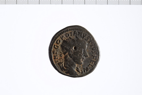 Dritto: Busto di Gordiano III a d. radiato, drappeggiato e corazzato.. Rovescio: Apollo stante di faccia, testa a d., braccio d. sollevato sulla testa e braccio s. appoggiato su una colonna; arco e frecce ai piedi.