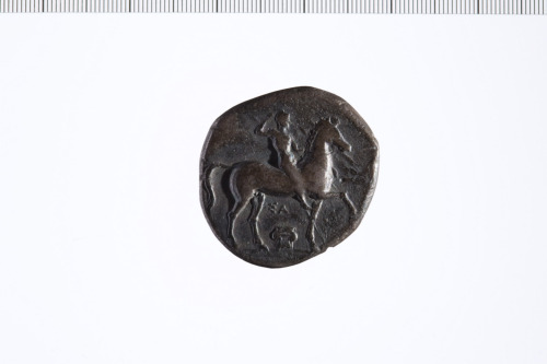 Dritto: Cavaliere galoppa a d.; sotto capitello di colonna dorica.. Rovescio: Taras cavalca il delfino a s.