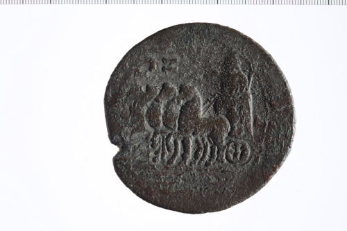 Dritto: Busto laureato di Antonino Pio a d., paludato, corazzato, di tre quarti, in avanti.. Rovescio: Serapide in quadriga a s., tiene la d. alzata, con la s. regge uno scettro.
