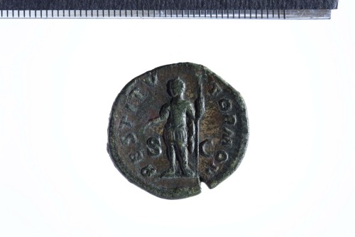 Dritto: Busto radiato di Alessandro Severo a d., con egida?; contorno perlinato.. Rovescio: Imperatore in abiti militari stante a s., reggente scettro nella s.; mano d.protesa; contorno perlinato.